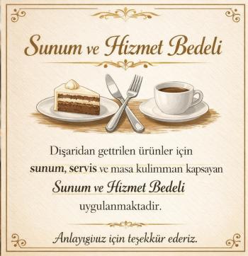 İşletmemizde dışarıdan getirilen ürünler için sunum, servis ve masa kullanım hizmetlerini kapsayan ( Kişi Başı )Sunum ve Hizmet Bedeli uygulanmaktadır. Anlayışınız için teşekkür ederiz.